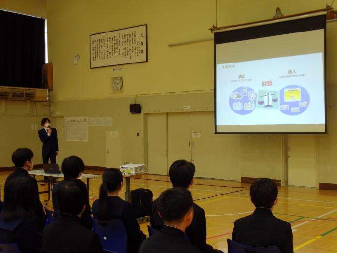 日本の財政について歳入歳出の内訳や、国債の残高、少子高齢化に伴う日本の社会の変化など、次のグループワークにつながる知識の習得のため講演を行いました。