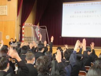 当日は、当出張所の職員が講師となり、国の財政や税金について説明したほか、生徒それぞれが国の予算編成をシミュレーションし、グループに分かれ意見交換しました。