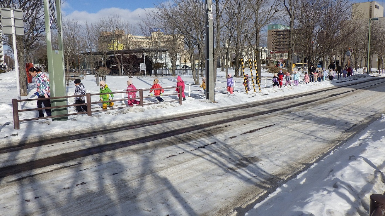 雪道の中を走って避難する園児達