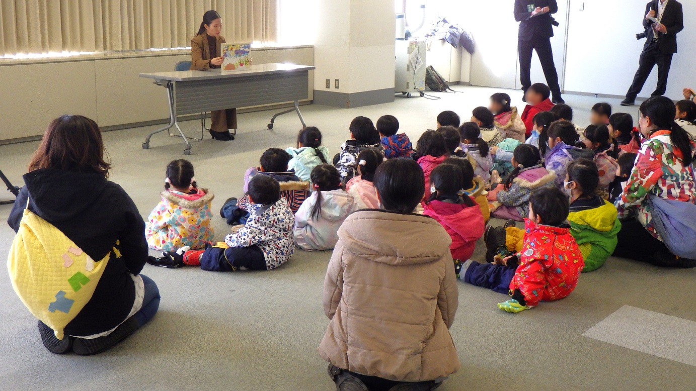 避難後、釧路財務事務所職員が防災紙芝居「じしんがおきたら」の読み聞かせを行い、園児たちは、地震が起きたら「どうするか」「どこに逃げるのか」といった身の守り方を真剣に学びました。