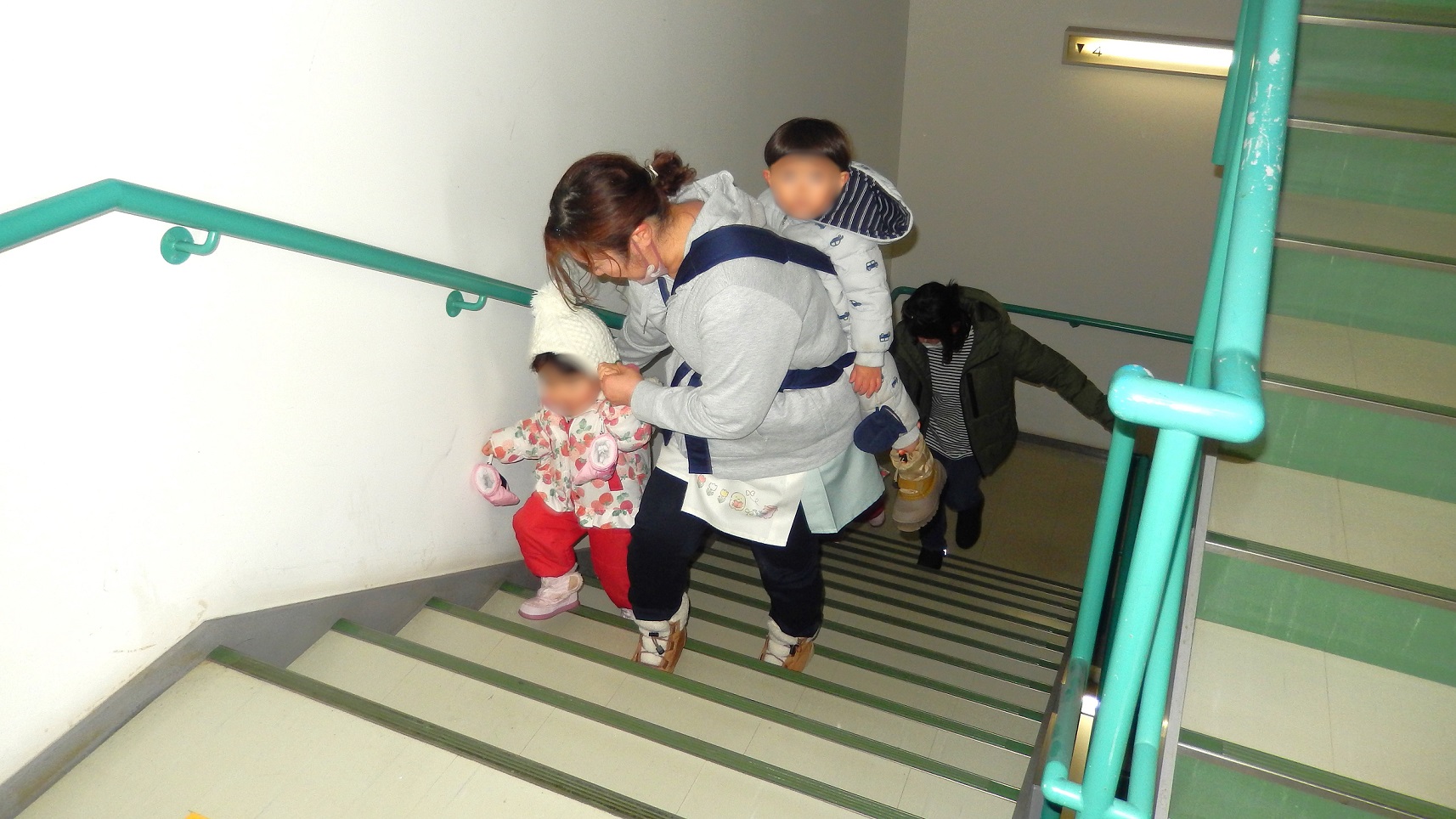 先生と一緒に合同庁舎の階段を上る園児達